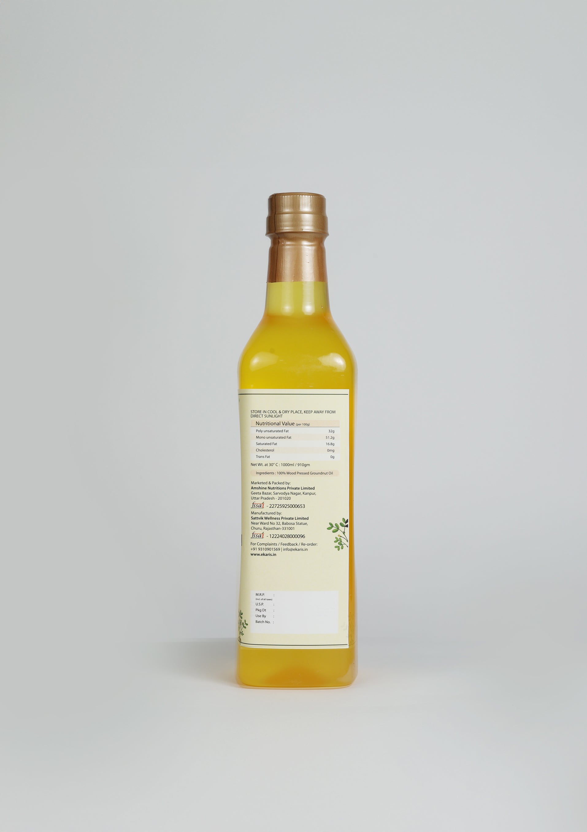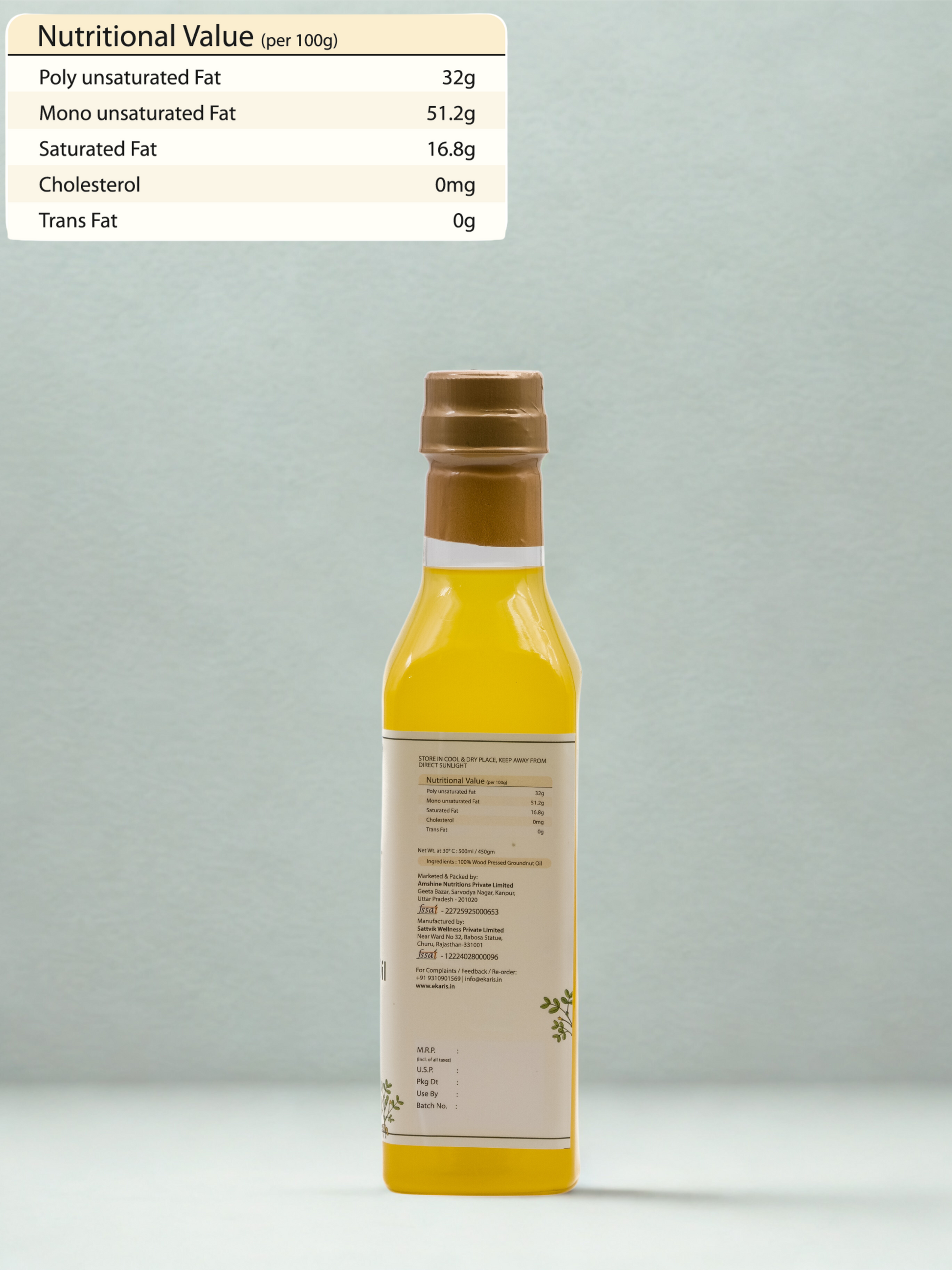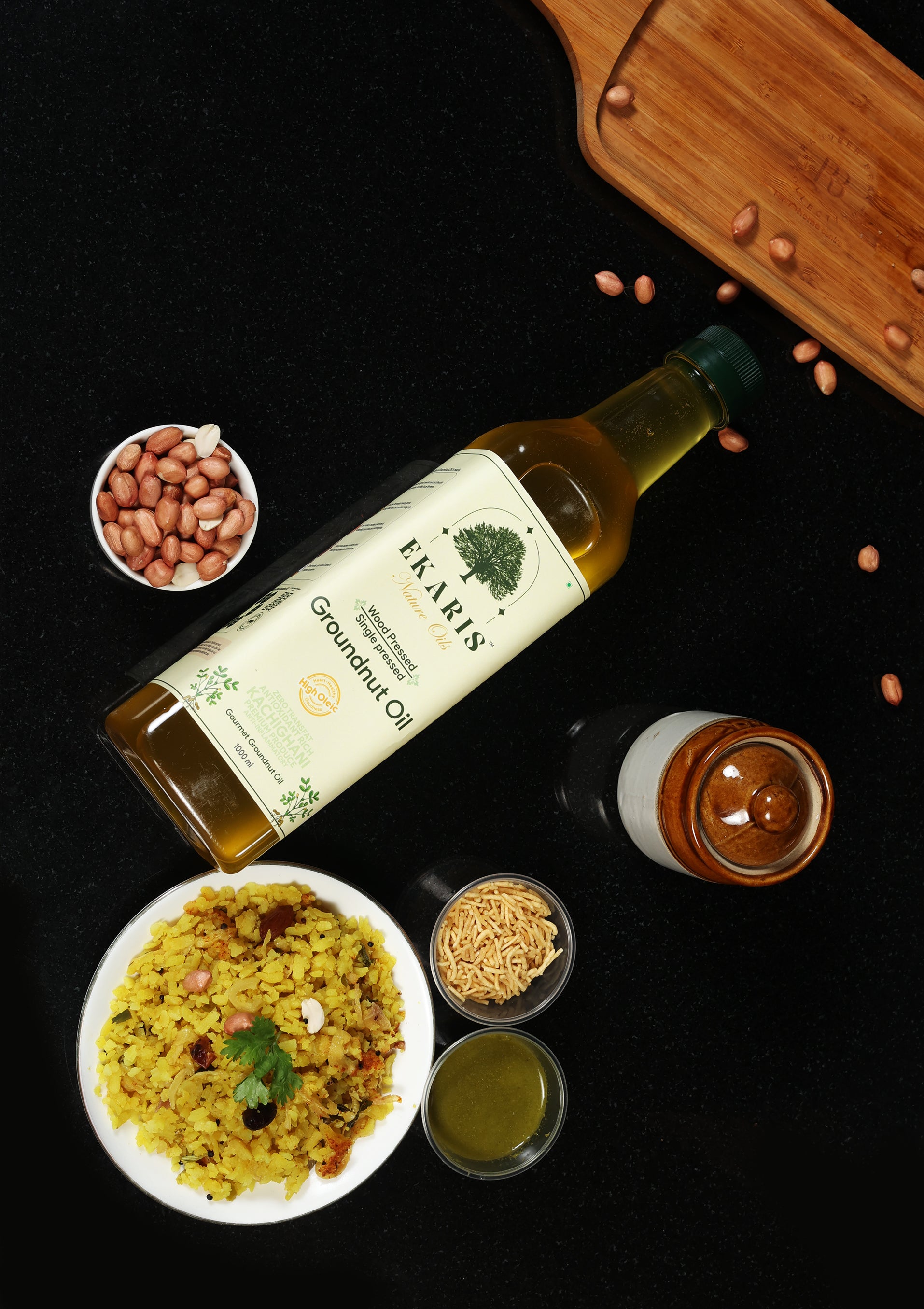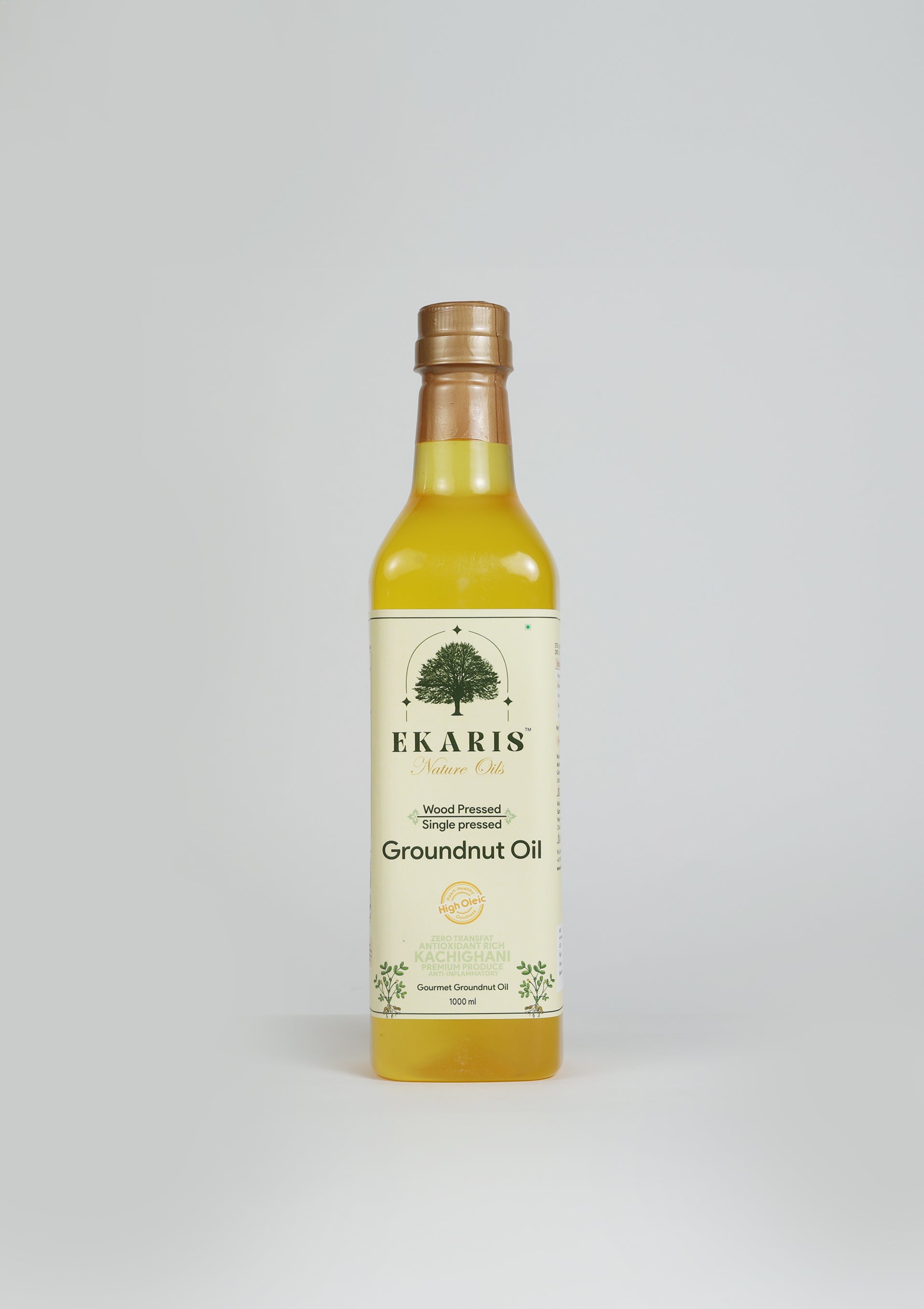 Ekaris Wood-Pressed Groundnut Oil is single-pressed in a traditional wooden ghani from hand-shelled, non-GMO peanuts. The cool extraction locks in a naturally sweet aroma, vitamin E, and heart-friendly monounsaturated fats—ideal for crisp frying, flavorful tadkas, and everyday wholesome cooking.