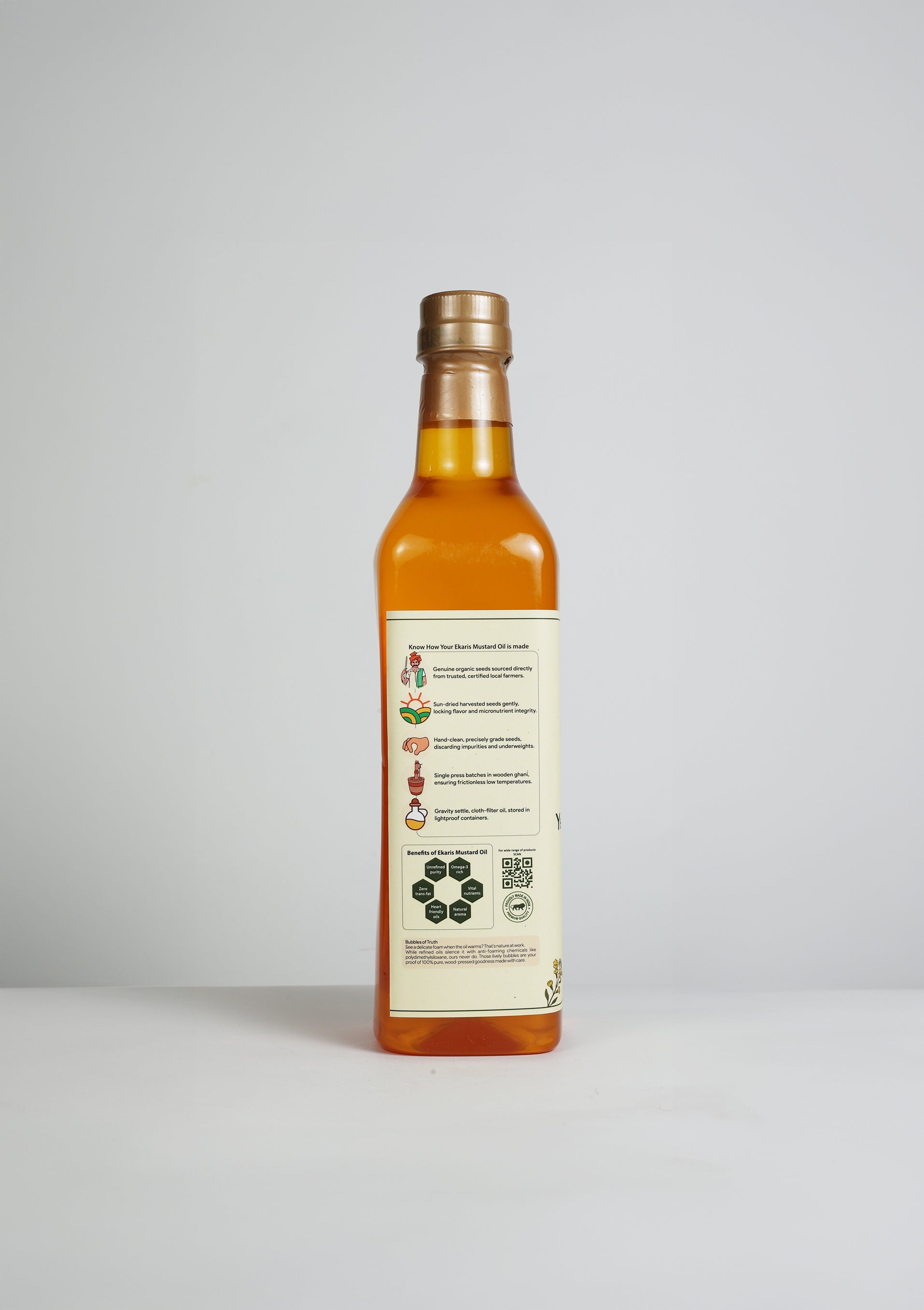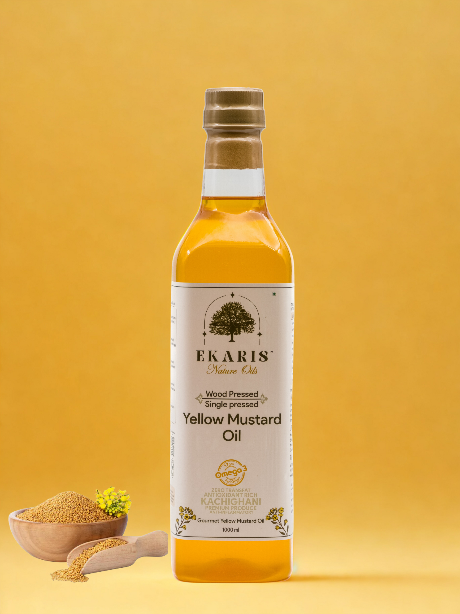 Ekaris Wood-Pressed Yellow Mustard Oil is single-pressed from sun-ripened yellow seeds in a traditional wooden ghani, locking in gentle warmth, light-gold clarity, and a subtly spicy aroma. Rich in natural Omega-3 and vitamin E, this chemical-free oil lends a smooth, zesty finish to sautéing, stir-fries, and pickles while keeping nutrients—and purity—fully intact.